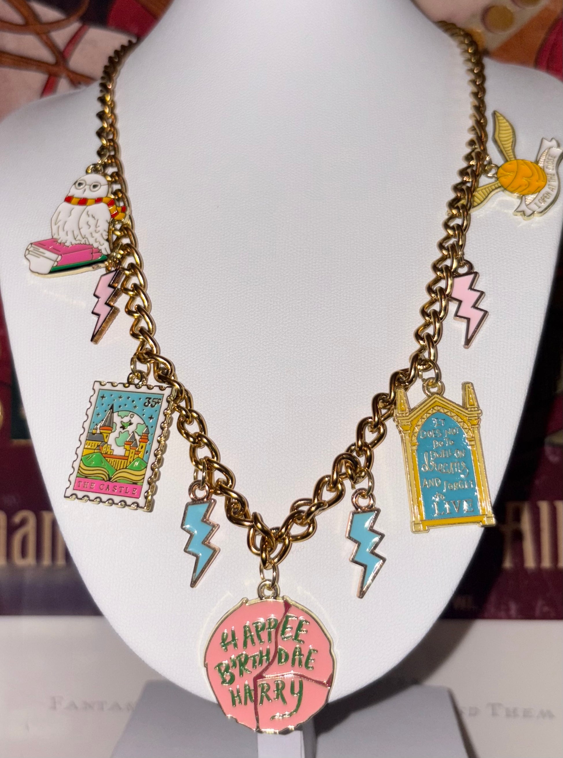 Gold steel electroplated chain 18in toggle clasp with assorted character charms..