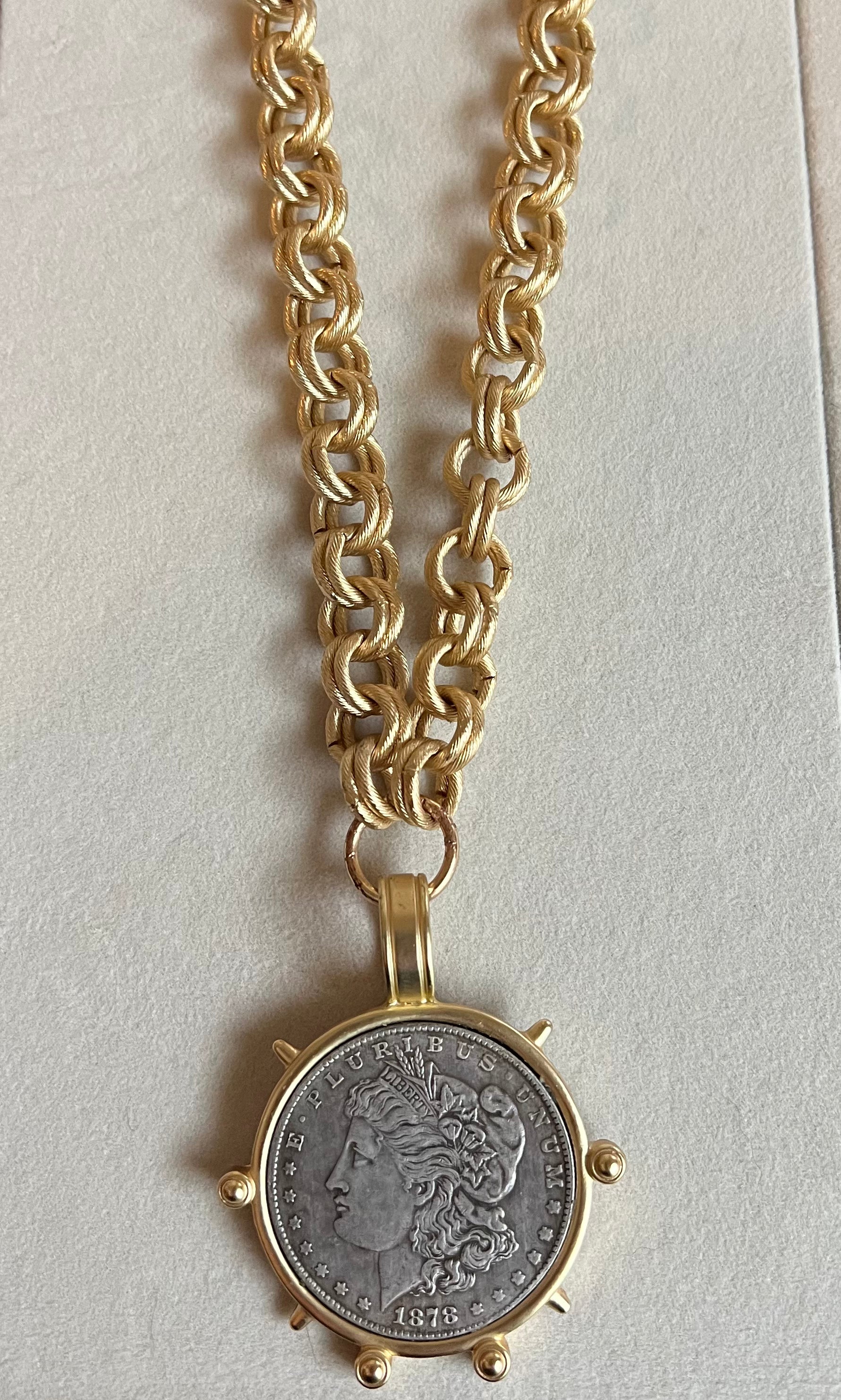 Double link chain necklace with extra large coin pendant makes a great layering piece or adds a polished and sophisticated look to any outfit.